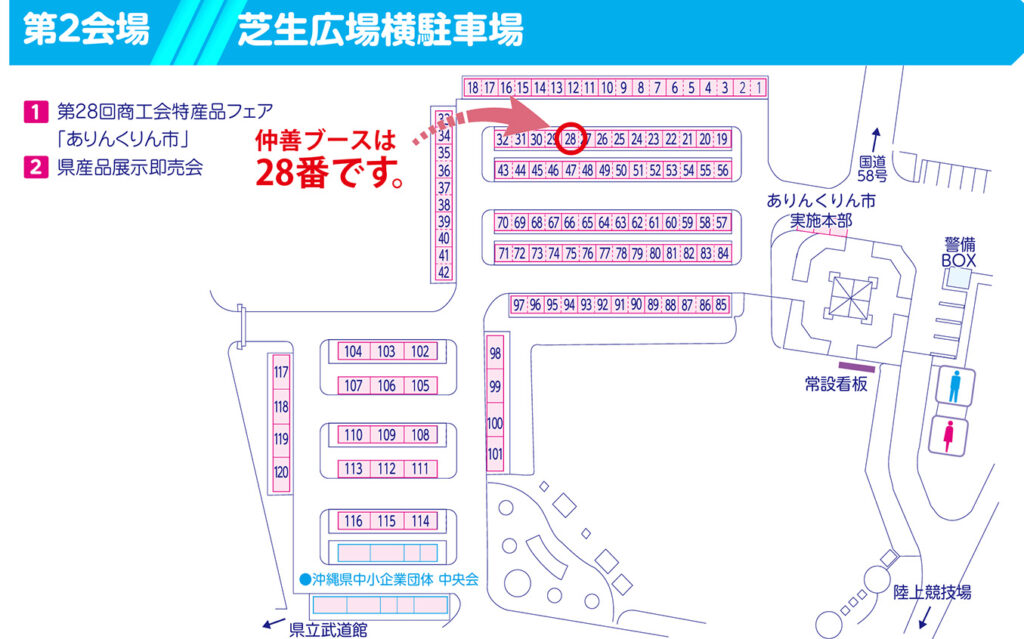 出展会場(仲善ブース):第2会場 芝生広場横駐車場 28番ブース